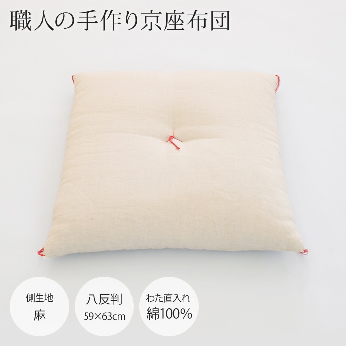 | 商品詳細 | 京座布団 八反判(59×63cm) 麻【わた直入れ●綿100%】 職人が一枚ずつ手作業でお作りする、こだわりの京座布団です。 生地の裁断、縫製やわたを詰めるなど全ての工程を手作業で行います。 上品な光沢とシャリ感を持ち、通気性や吸湿・発散性に優れる「麻」を使用して製作します。 |