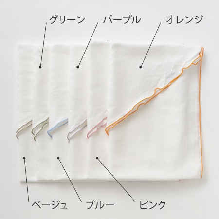 商品詳細 4日間釜熟成「京和晒綿紗」(きょうわざらしめんしゃ)ガーゼを使用したマーガレットストールです。 お洗濯するほどにやわらかく、ふんわりと風合いがよくなります。 ホルムアルデヒド0なので、敏感肌の方やアトピーの方も安心してお使いいただけます。 サイズ フリーサイズ 着丈(約63cm)袖丈(約90cm)全幅(約140cm) 仕様 素材:綿100% 四日間釜熟成 京和晒綿紗 仕様:98本ガーゼ使用 縁取り:グリーン、パープル、オレンジ、ベージュ、ブルー、ピンク 生産 日本製 お手入れ方法 ・お洗濯の際には洗濯ネットをご利用頂き、タンブラー乾燥はお避けください。 ・洗剤は無蛍光洗剤をご使用ください。 ・お洗濯後、四方のシワをのばし、形を整えて干してください。 ・お洗濯頂くほど、一層風合いがよくなり、ナチュラルな肌ざわりをお楽しみいただけます。 オプション