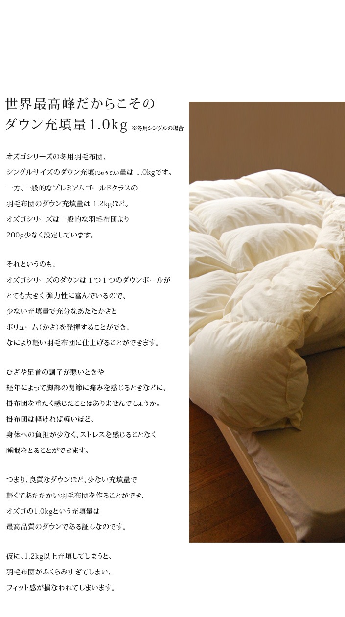 | 商品詳細 | [オズゴ]春夏用肌掛け羽毛布団 ポーランド産ホワイトグースダウン95%(コウダ種) 100番手超長綿サテン生地 ポーランド産ホワイトグース95%(コウダ種)の最高品質のプレミアムゴールドラベル羽毛布団です。 ご注文いただいてから、1枚1枚丁寧にお作りします。 大東寝具工業では、日本羽毛寝具製造共同組合が平成15年より見直した、厳しい基準での羽毛ダウン含有率の表示、新基準に適合したお品をお届けしています(新基準適合商品マークのないものは除きます)。 ●大東寝具工業の羽毛布団はNET表示● 正味のダウン量を表示しています。 大東寝具工業の新基準羽毛布団は、家庭用品品質表示法によるダウン率表示の許容範囲である+-5%の誤差を採用せず、品質ラベルに記載されているダウン比率かそれ以上のダウンを使用しています。 【 ※ご注意下さい※ 】 本商品は春夏用です。 冬用ではございませんのでお間違いにならないようご注意ください。 |