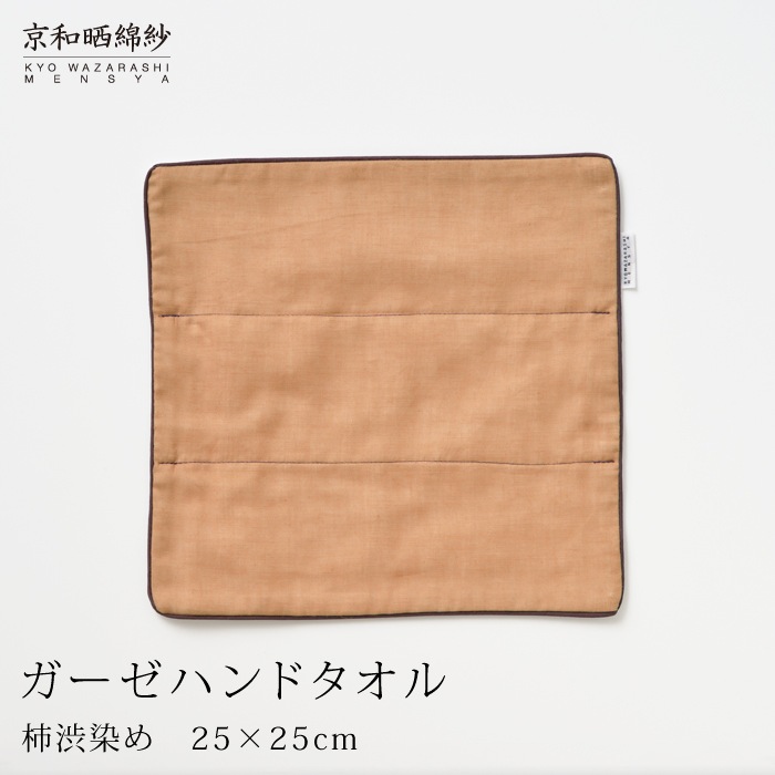 商品詳細 京和晒綿紗ガーゼハンドタオル 柿渋染め 4日間釜熟成「京和晒綿紗」(きょうわざらしめんしゃ)ガーゼを使用したガーゼタオルです。 お洗濯するほどにやわらかく、ふんわりと風合いがよくなります。 ホルムアルデヒド0なので、敏感肌の方やアトピーの方も安心してお使いいただけます。 サイズ 25×25cm 仕様 素材:綿100% 四日間釜熟成 京和晒綿紗 柿渋染め 仕様:98本ガーゼ使用 コットンパイピング パープル 生産 日本製 お手入れ方法 ・長時間日光に当てると色あせします。必ず陰干しをしてください。 ・お洗濯の際には洗濯ネットをご利用頂き、タンブラー乾燥はお避けください。 ・洗剤は無蛍光洗剤をご使用ください。 ・お洗濯後、四方のシワをのばし、形を整えて干してください。 ・お洗濯頂くほど、一層風合いがよくなり、ナチュラルな肌ざわりをお楽しみいただけます。 オプション