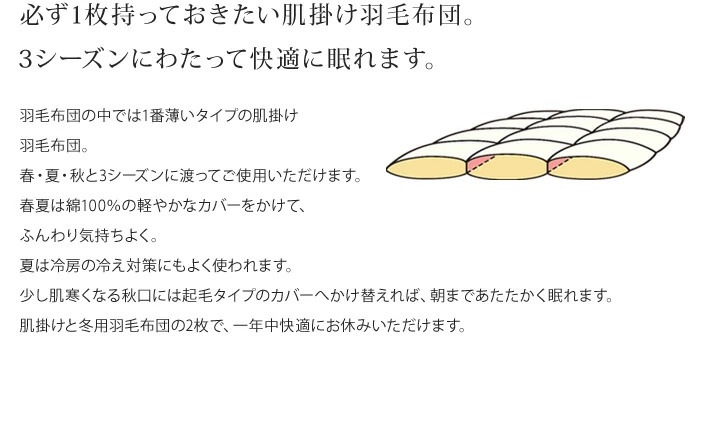 | 商品詳細 | [オズゴ]春夏用肌掛け羽毛布団 ポーランド産ホワイトグースダウン95%(コウダ種) 80番手超長綿サテン生地 ポーランド産ホワイトグース95%(コウダ種)の最高品質のプレミアムゴールドラベル羽毛布団です。 ご注文いただいてから、1枚1枚丁寧にお作りします。 大東寝具工業では、日本羽毛寝具製造共同組合が平成15年より見直した、厳しい基準での羽毛ダウン含有率の表示、新基準に適合したお品をお届けしています(新基準適合商品マークのないものは除きます)。 ●大東寝具工業の羽毛布団はNET表示● 正味のダウン量を表示しています。 大東寝具工業の新基準羽毛布団は、家庭用品品質表示法によるダウン率表示の許容範囲である+-5%の誤差を採用せず、品質ラベルに記載されているダウン比率かそれ以上のダウンを使用しています。 【 ※ご注意下さい※ 】 本商品は春夏用です。 冬用ではございませんのでお間違いにならないようご注意ください。 |