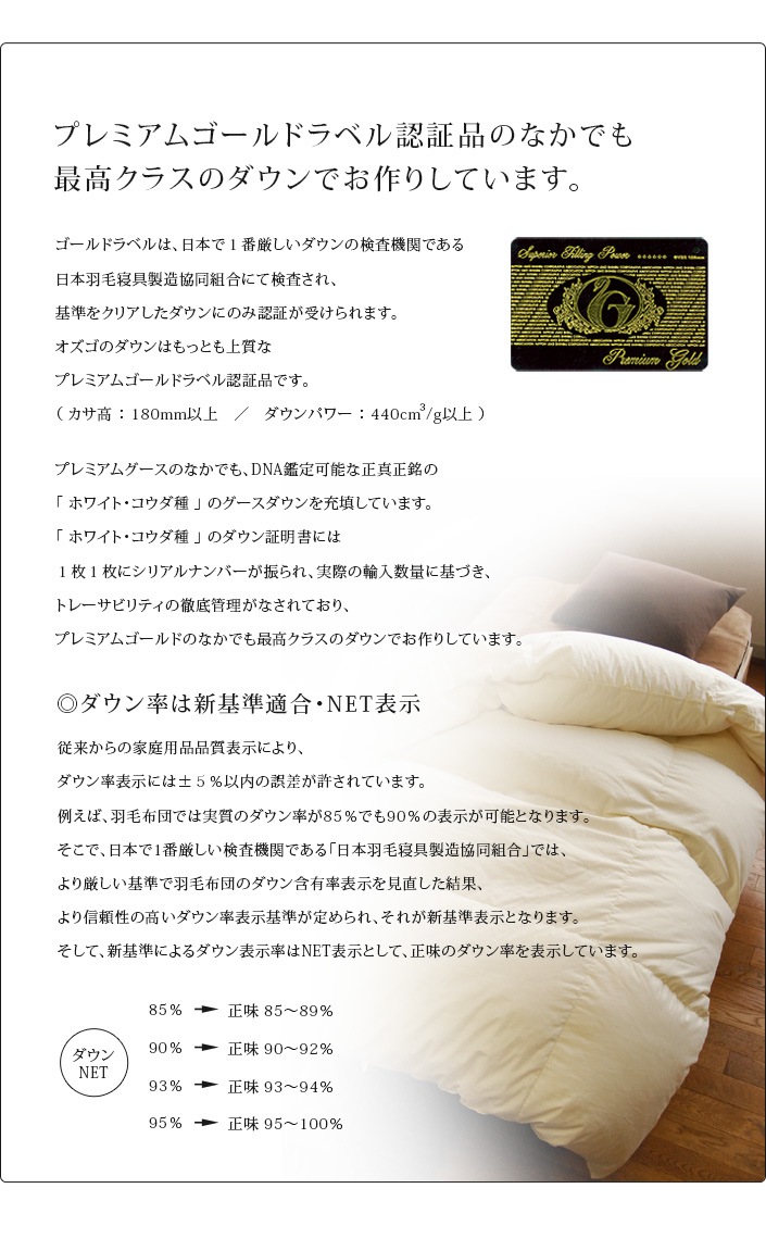 | 仕様 | ・プレミアムゴールドラベル認証(440dp/約800fp) ・ポーランド産ホワイトグース95%(コウダ種)……充填量:0.9kg ・合掛け羽毛布団……5×6マス ・3cmマチ立体キルト ・側生地:綿100%(80番手サテン超長綿) ・ピュアオゾン加工(消臭、抗菌、防カビ、防ダニ) ・ファインプロテクト加工(徐塵、熱処理) ・国内羽毛洗浄、及び砂鉄など不純物除去 ※ダウンパワー(dp) 羽毛1g/cmあたりの膨らみを数値化したもので、高品質な羽毛ほど数値が大きくなります。 ダウンパワー値が大きいと同じ重さでもボリューム感が増し、空気をたくさん含むことができるので保温性が高く温かい羽毛布団になります。 ※フィルパワー(fp) 羽毛30g/inchあたりの膨らみを数値化したもので、高品質な羽毛ほど数値が大きくなります。 元々、欧米などで使用されている基準で、羽毛布団以外ではダウンジャケットなどのあたたかさを示す際に使用されています。 ※プレミアムゴールドラベル 日本羽毛寝具製造業協同組合の品質基準(組成混合率、カサ高性、清浄度など)に合格した羽毛原料と優良な側生地を使用し、適正な縫製で仕上げられた品質安心羽毛布団の証です。 |