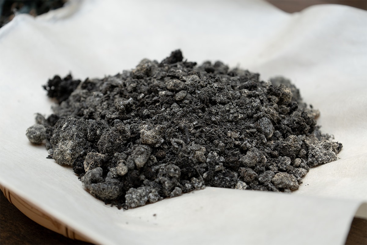 藍染めの元となる原料は藍の一大産地である、徳島県産の蒅(すくも)。