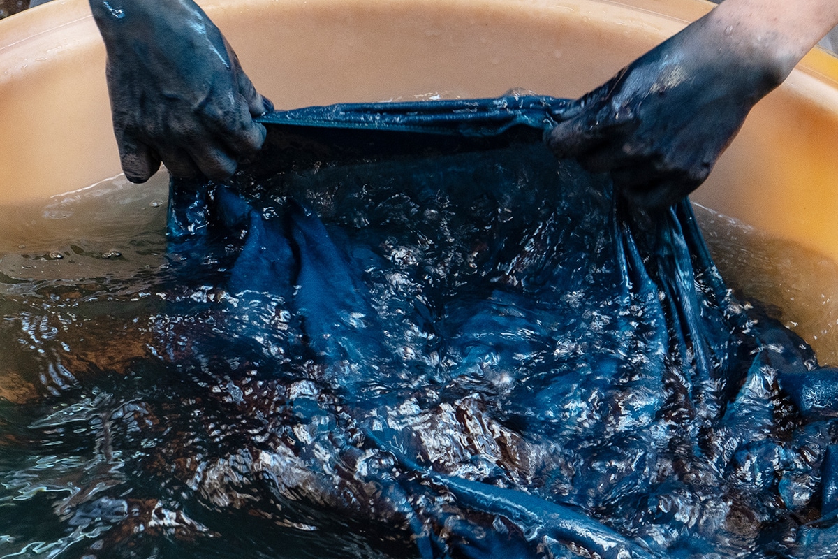 藍師により藍の収穫から半年もの長い時間をかけて作られた蒅を、甕の中でさらに熟成させ職人の手で丁寧に染め上げる。