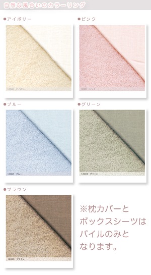 | カラーについて | パイルとダブルガーゼのカラーの組み合わせをご選択いただけます。 カラーのオーダーいただく場合は、お電話(フリーダイヤル 0120-557-017)でお問い合わせください。 |