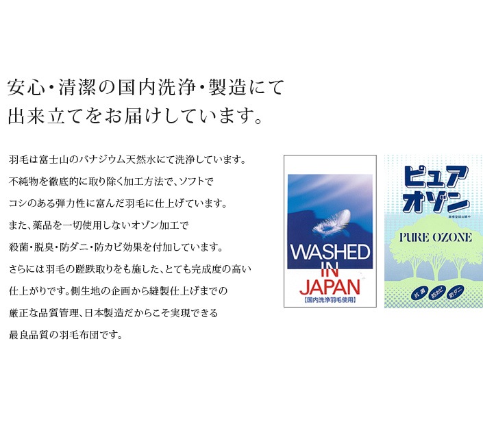 | 仕様 | ・プレミアムゴールドラベル認証(440dp/約800fp) ・ポーランド産ホワイトグース95%(コウダ種)……充填量:0.6kg ・肌掛け羽毛布団……6×8マス ・3cmマチ立体キルト ・側生地:綿100%(80番手サテン超長綿) ・ピュアオゾン加工(消臭、抗菌、防カビ、防ダニ) ・ファインプロテクト加工(徐塵、熱処理) ・国内羽毛洗浄、及び砂鉄など不純物除去 ※ダウンパワー(dp) 羽毛1g/cmあたりの膨らみを数値化したもので、高品質な羽毛ほど数値が大きくなります。 ダウンパワー値が大きいと同じ重さでもボリューム感が増し、空気をたくさん含むことができるので保温性が高く温かい羽毛布団になります。 ※フィルパワー(fp) 羽毛30g/inchあたりの膨らみを数値化したもので、高品質な羽毛ほど数値が大きくなります。 元々、欧米などで使用されている基準で、羽毛布団以外ではダウンジャケットなどのあたたかさを示す際に使用されています。 ※プレミアムゴールドラベル 日本羽毛寝具製造業協同組合の品質基準(組成混合率、カサ高性、清浄度など)に合格した羽毛原料と優良な側生地を使用し、適正な縫製で仕上げられた品質安心羽毛布団の証です。 |