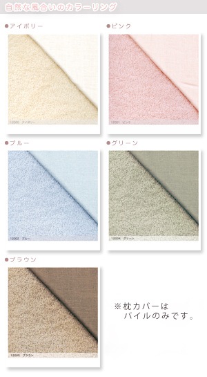 | 商品詳細 | 「タオル&ダブルガーゼ」カバーシリーズ タオルの枕カバー タオルのようなふかふか肌ざわりのパイルが心地よい枕カバー。 綿100%素材なので、蒸れにくく快適。 夏は涼しく冬は暖かいので、オールシーズンご使用いただけます。 ※枕カバーはタオル(パイル)のみとなります。 |