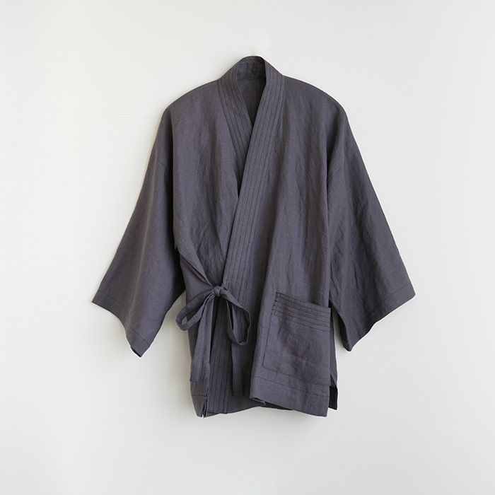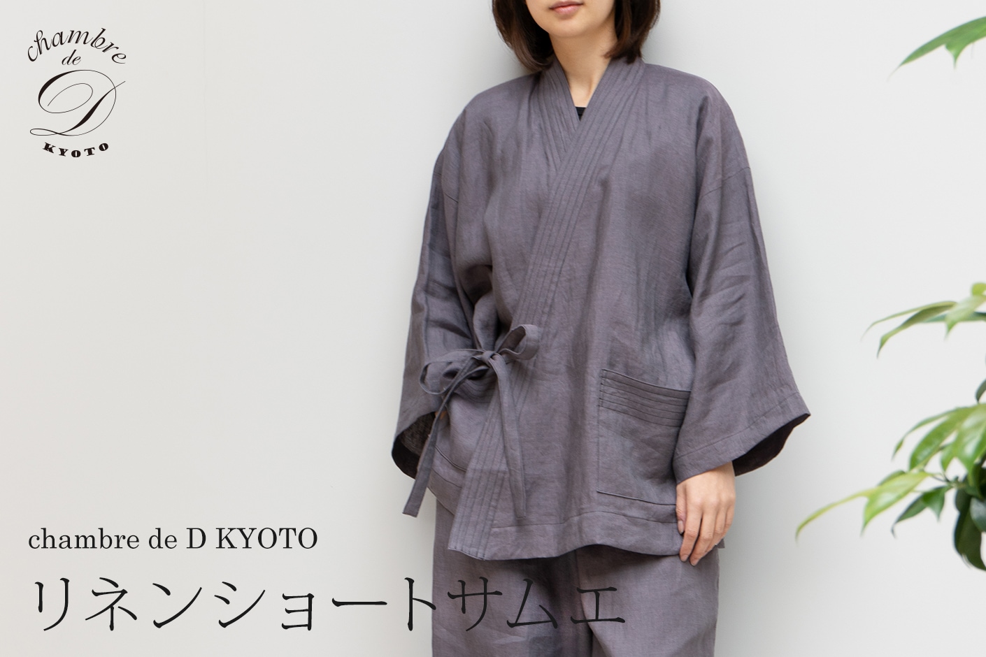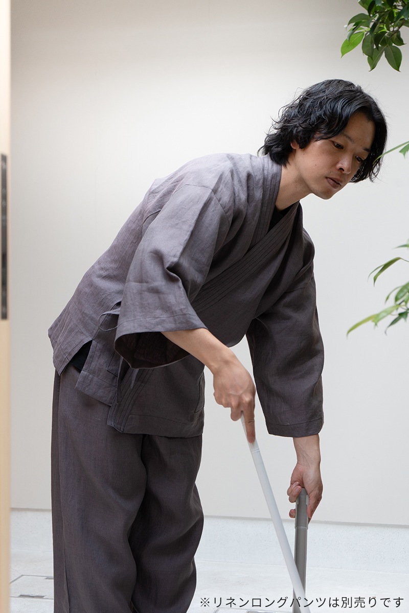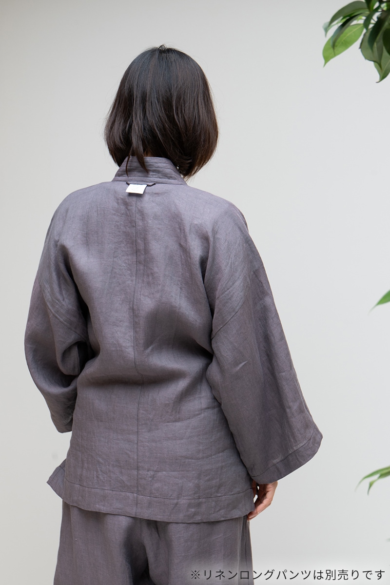 作務衣を元にデザインし、深みのあるダークパープルで仕上げたリネンショートサムエ。